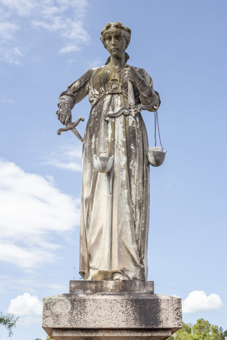O monumento funerário Plácido de Castro, constituído em mármore sobre uma base de granito, apresenta uma alegoria da injustiça: a figura feminina tem a venda dos olhos levantada e a balança é forçada a pender pela espada. No lado pendente da balança há um saco de dinheiro. A alegoria está sobre um pedestal e na base deste – sobre a campa do túmulo – um grande leão atacado pelas costas, em analogia à morte de Plácido de Castro, conforme suas últimas palavras inscritas em seu epitáfio: