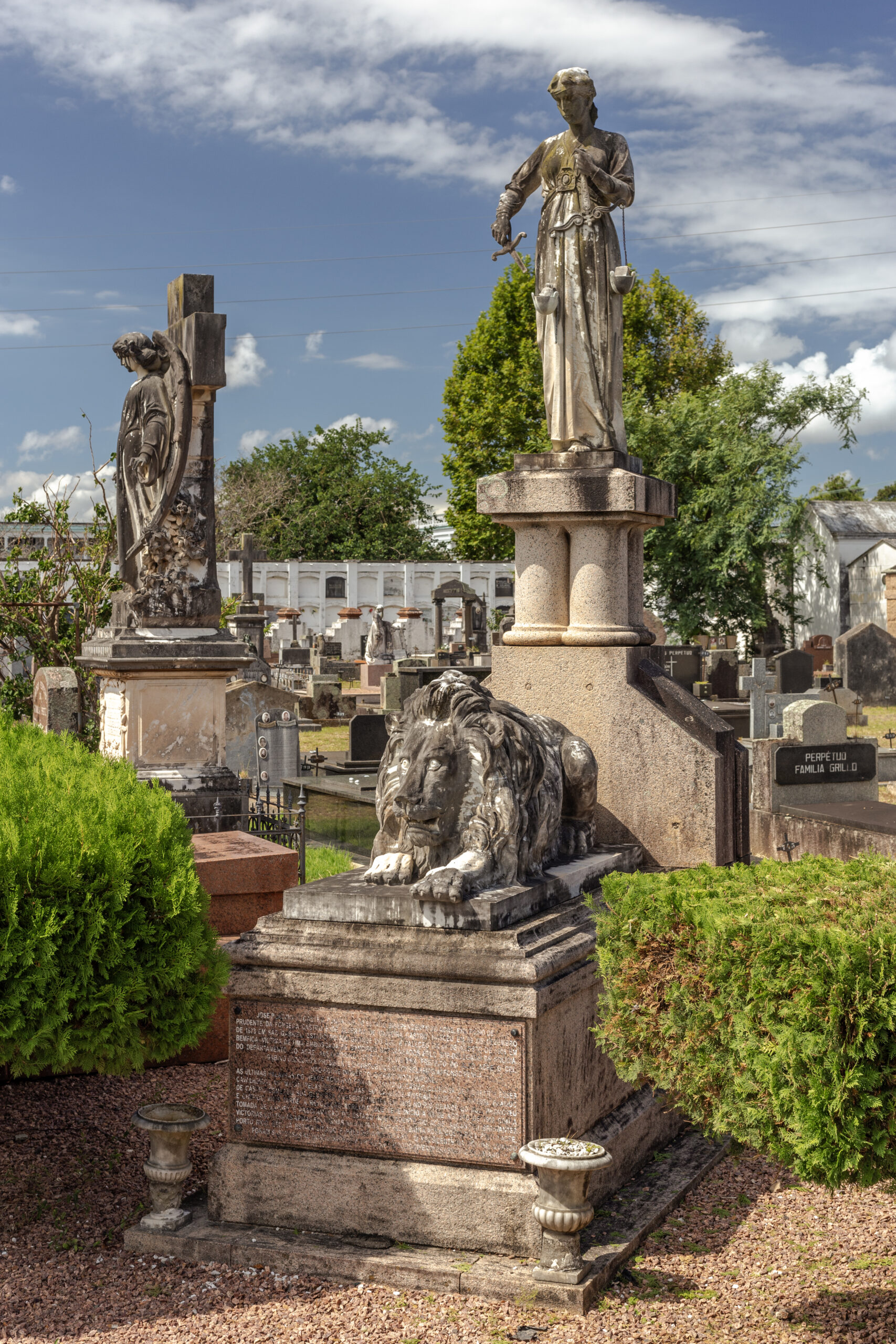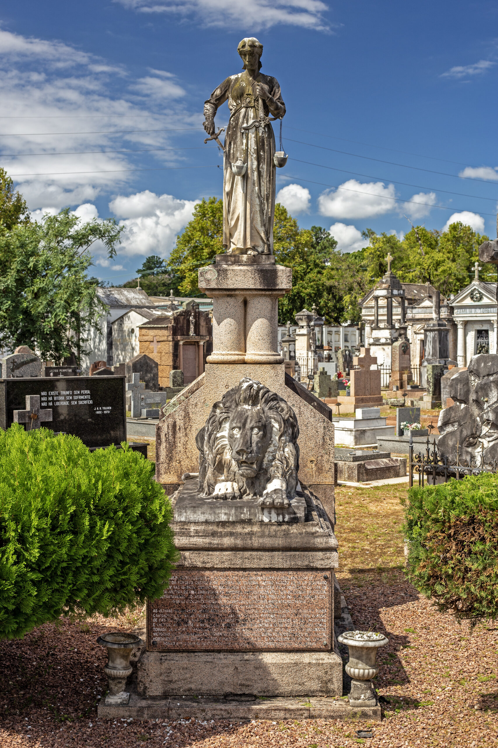 O monumento funerário Plácido de Castro, constituído em mármore sobre uma base de granito, apresenta uma alegoria da injustiça: a figura feminina tem a venda dos olhos levantada e a balança é forçada a pender pela espada. No lado pendente da balança há um saco de dinheiro. A alegoria está sobre um pedestal e na base deste – sobre a campa do túmulo – um grande leão atacado pelas costas, em analogia à morte de Plácido de Castro, conforme suas últimas palavras inscritas em seu epitáfio: