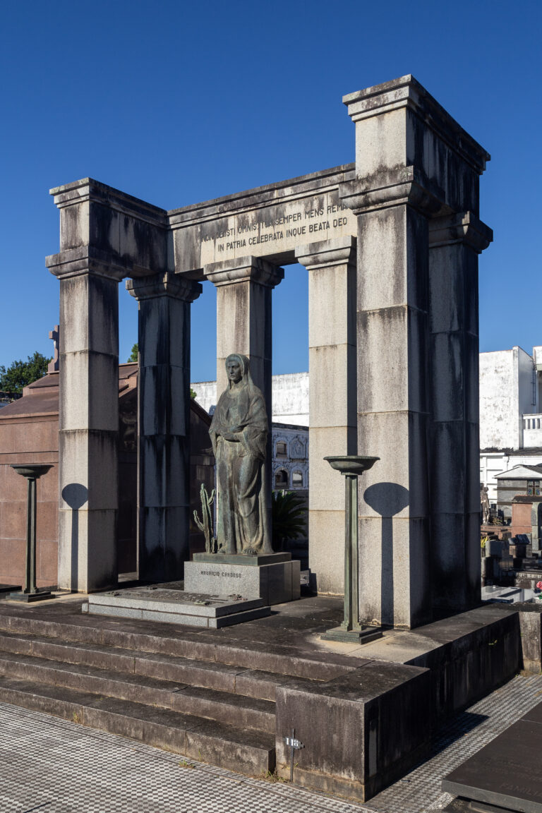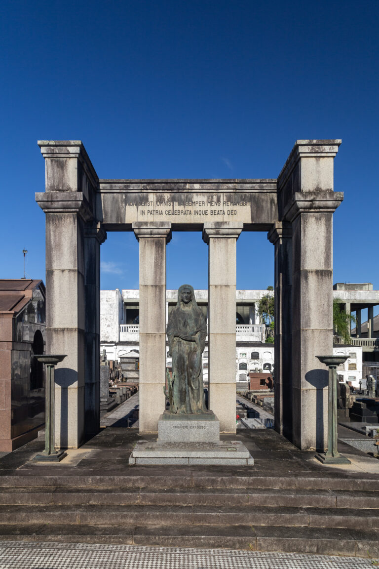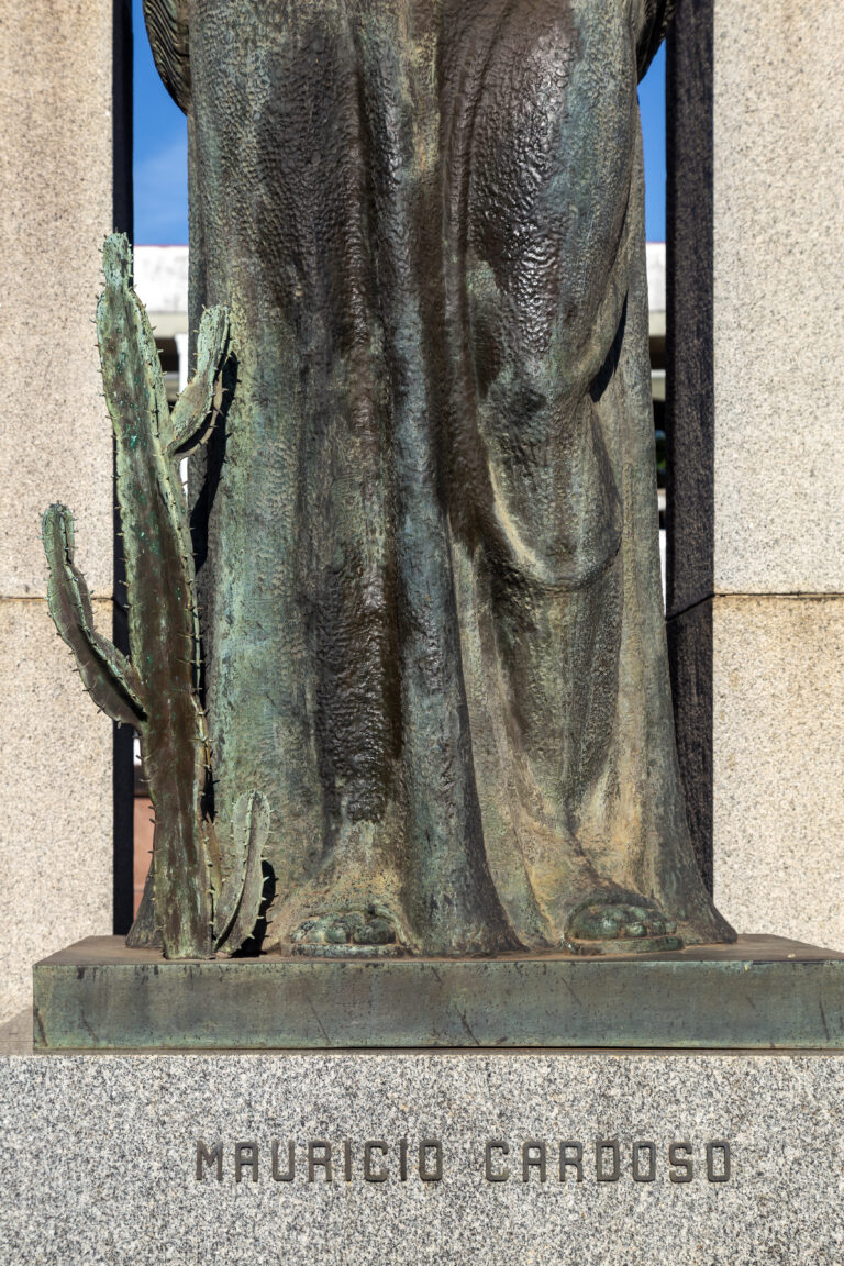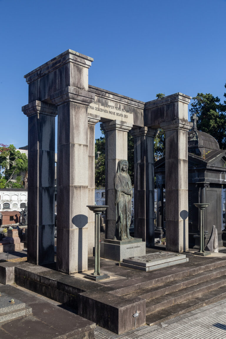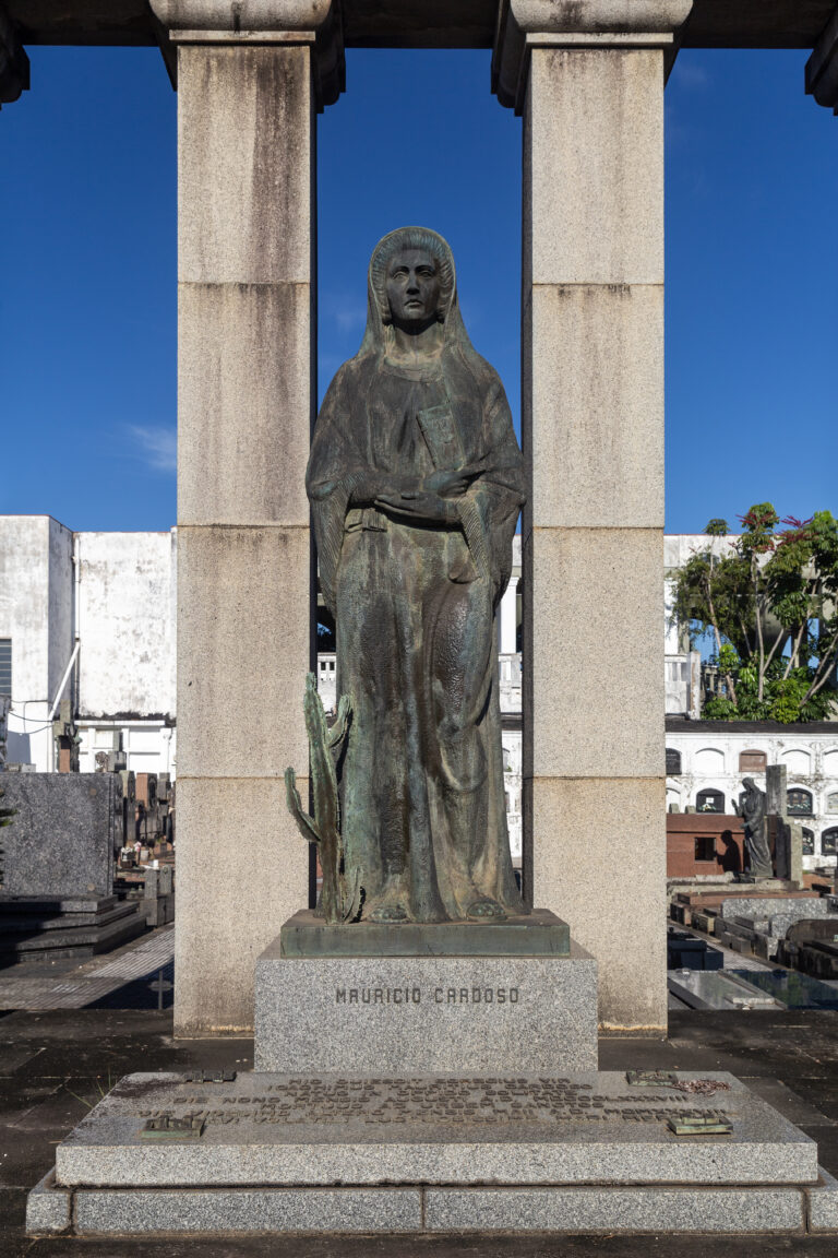 No monumento funerário Maurício Cardoso, constituído em granito, vê-se uma grande figura feminina em bronze, que aparece na posição de contraposto, com um livro em seu braço esquerdo onde lemos ‘VIRTUS’. Trata-se de uma alegoria da virtude, com a qual podemos fazer analogia com as virtudes do falecido. Aos seus pés um cacto, relacionado às dificuldades que Cardoso encontraria em seu caminho como advogado e político. Os referenciais da antiguidade clássica também aparecem nas colunas dóricas estilizadas. O artista, Antônio Caringi (1905-1981) formou-se em plástica monumental na Alemanha e esta obra, sem dúvida, mostra a aptidão do artista em esculpir em grandes dimensões.