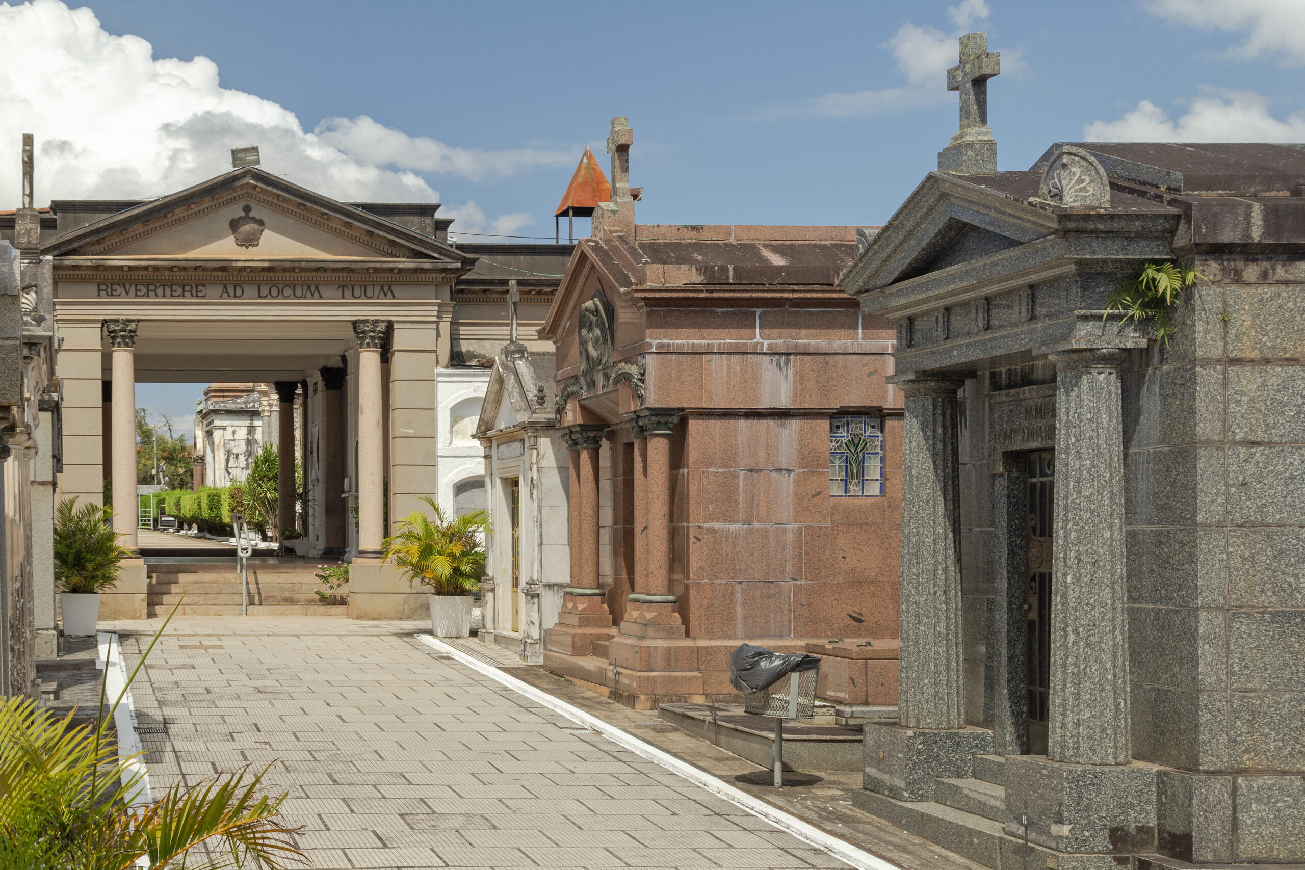 O pórtico de entrada é uma obra moderna (1934), da época em que os terrenos da frente do cemitério passaram a receber construções tumulares igualmente modernas, tanto de políticos e militares, como da burguesia da capital gaúcha. Após se adentrar essa portaria, chega-se à parte antiga do cemitério, onde estão sepultados os vultos do positivismo e outras personalidades da história do Rio Grande do Sul. A entrada principal e os muros do cemitério remontam à época de sua inauguração nos anos de 1850. O estilo dessa portara moderna dialoga com o da capela do cemitério, reformada na década de 1950, projeto do engenheiro civil Humberto Della Mea.